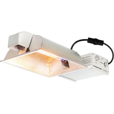 The Phantom DE Low Profile Lighting System is an excellent choice for a range of applications. It combines a Phantom reflector with a controllable Phantom DE Low Profile ballast and a 2100 µmol/s PHANTOM PRO DE high-pressure sodium lamp (excluding NL systems). This commercial-grade system allows users to adjust light levels for their particular setup and photoperiod. This system is able to be operated remote or attached, and is available in both open and enclosed reflector configurations. Both are made from multifaceted 95% reflective hammertone aluminum.