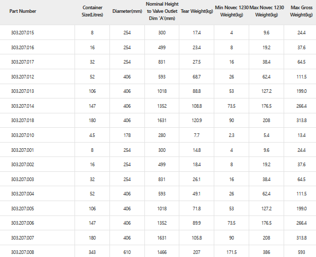 Each assembly may be provided with a range of fills to suit the design requirements. After filling, the containers are superpressursed with dry nitrogen to 25 bar +5%(at a temperature of 20?). The maximum filling density for Novec 1230 is 1.2kg/litre and the minumum is 0.5kg/litre. Dimensions and weights of each assembly are shown in Tables 15 and 16.
