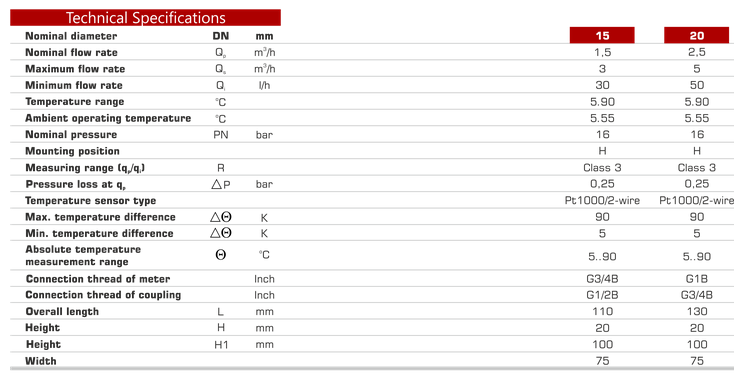 Mechanical heat meter. Electronic sensor control. Lithium battery lifetime10 years. Reading date for billing. Single-line-8-digit display dor easy meter ending. Optional pulse, M-bus Radio frequency output. Sealed electronic unit (IP54). Brass housing. Water temperature up to 90°C.