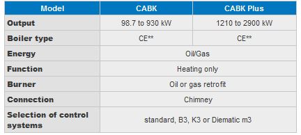 The CABK and CABK Plus range are steel boilers to be fitted out with oil or gas burner and a choice of four control panels: standard, B3, K3 or DIEMATIC m3. Their steel single block two flue gas path heating body helps them to achieve an efficiency of up to 92.4% depending on the model. The combustion chamber is especially designed to adapt easily to all blown air oil and gas burners, including ones with low nitrogen oxide emissions.