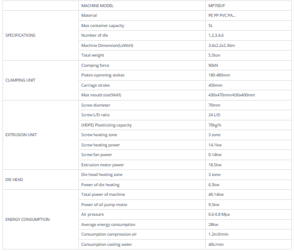 MP70D is specifically designed for making bottles from 50ml up to maximum 5L. It is hydraulic driven with accrate eletrical control system. MP70D has double stations to increase the production efficiency. Also, it has variety of choice of die heads. With more than 10 years of success in the market, MP70D is updated to be one of the most reliable and popular model in the world