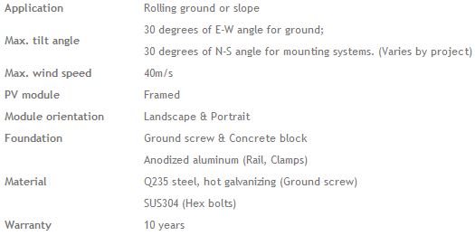 Specially designed for rolling ground or slope. Flexibly adjusted up, down, left and right. Maximized pre-assembly, great savings on labor and cost. All aluminum design, excellent endurance, light-weighted. E-W angle of ground should be a maximum of 30 degrees.