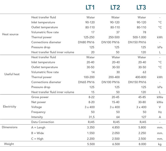 In the case there are heat sources with very low temperatures, above 90 °C, the Rank® LT machines allow their use through electric generation. Also, it is complemented with the possibility of using the useful heat at temperatures up to 50 °C. Within the Rank® LT category, we find different products that allow electricity production up to 80 kWe from heat sources up to 1,000 kWt.