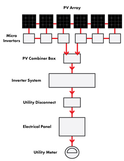 A Photovoltaic (PV) system that uses micro inverters is the newest method to produce solar electricity. It is a Grid-Tied, Net-Metered system, but instead of having a single central inverter, there is one small inverter for every PV module. They are installed on the back of the module or on the same rails as the modules. The micro inverters convert the DC electricity from each module individually into AC electricity.