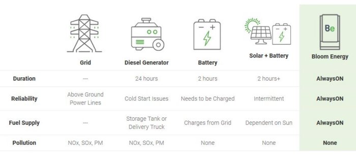Bloom Energy`s AlwaysON Microgrid is the only available power solution that provides power both when the grid is available and when it is down, in perpetuity. No existing backup power option offers continuous power no matter the circumstances.