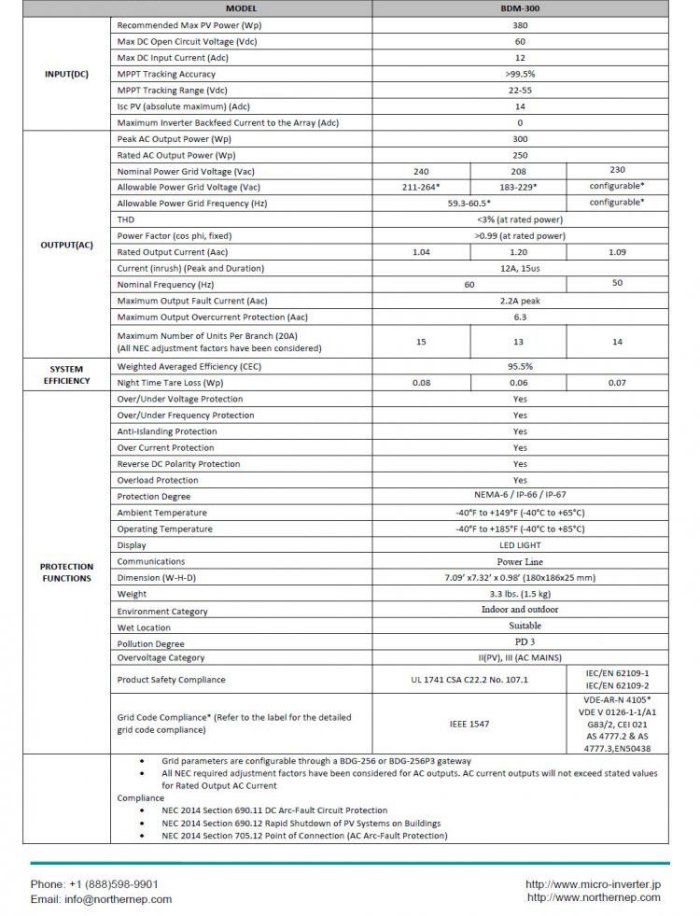 Qualified equipment that meets Hawaiian Electric TrOV-2 and full frequency and voltage ride-through. Cable options including conventional trunk cable and daisy chain. Thinnest micro inverter in world, 25mm in thickness. Designed for frame mount (AC module), as well as rail mount solutions. High continuous output power up to 300Wac, recommended for max 380W solar panels. High efficiency with 95.5% CEC. Globally certified for c-ETL-us, SAA, TUV, VDE-AR-N 4105, VDE 0126, G83/2,CEI 021, IEC61727,EN50438. Integrated grounding for easy installation. NEMA-6/IP-66/IP-67 enclosure rating. Integrated monitoring and power line communication with BDG-256 gateway. Fully comply with NEC 2014/2017 section 690.12 Rapid Shutdown requirement. No additional equipment is required.