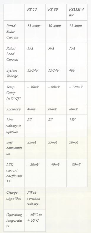 Manufacturer Part Number: PS-15Morningstar’s ProStar is the world’s leading mid-range solar controller for both professional and consumer applications. This second generation ProStar: Adds new features and protections using highly advanced technology Provides longer battery life and improved system performance Sets new standards for reliability and self-diagnosticsFeaturesStandard Versions available: 15 or 30 amp 12 / 24 or 48 volt negative or positive ground Estimated 15 year life PWM series battery charging (not shunt) 3-position battery select: gel, sealed or flooded Very accurate control and measurement Jumper to eliminate telecom noise Parallel for up to 300 amps Temperature compensation Tropicalization: conformal coating, stainless steel fasteners & anodized aluminum heat sink No switching or measurement in the grounded leg 100% solid state Very low voltage drops Current compensated low voltage