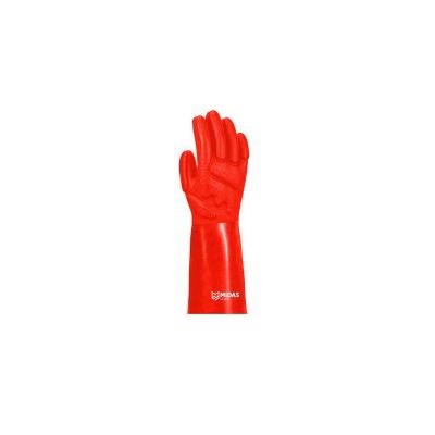 PVC 600 - Fluorescent Orange series, fully coated. Fluorescent Orange double dipped on White Nylon. Machine knit liner with Midas proprietary Rubber on the back of the hand Gauntlet 35 cm
