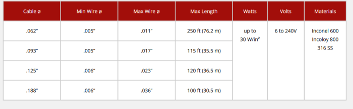 - Wide range of power out or W/Ft for individual MI heating cables, which ultimately allows us to make a cable heater with typical watt density up to 80 W/sq in.