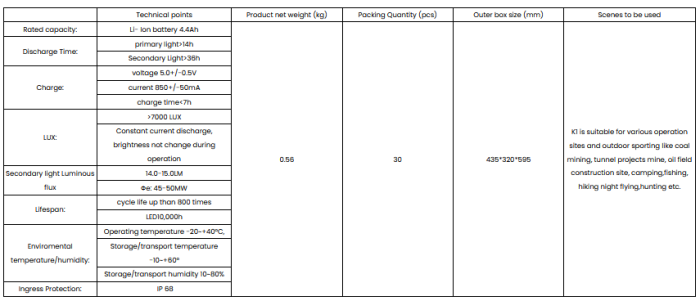 - With over charge & over-discharge resistant function and short circuit protection device, K1 lamp is very safe and realiable