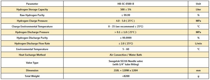 While charge with only 99,99% purity hydrogen the HB-FR07-0500-B is capable to provide high purity hydrogen (over 99.9999%). It makes HB-FR07-0500-B an ideal pure hydrogen source Fuel Cell systems, that is in addition easy to use and very safe.