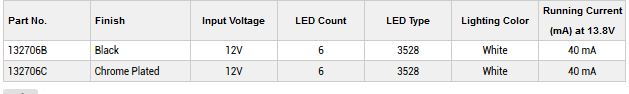 Innovative and retro-fit Mini LED License Plate Light, same appearance and mount hole centers as the traditional incandescent light, ideal for both retro-fit and new vehicles. Clear PC lens, ABS housing available in Black or Chrome Plated finishes. Surface mount. 6 LEDs of super bright SMD3528 type, long life span up to 100,000 hours. Circuit board completely sealed by epoxy to ensure its water proof feature. Meets DOT FMVSS 108/SAE requirements, Lens marking: L Rated for 12V, tested to 13.8V. Also available in 24V version by special order only.