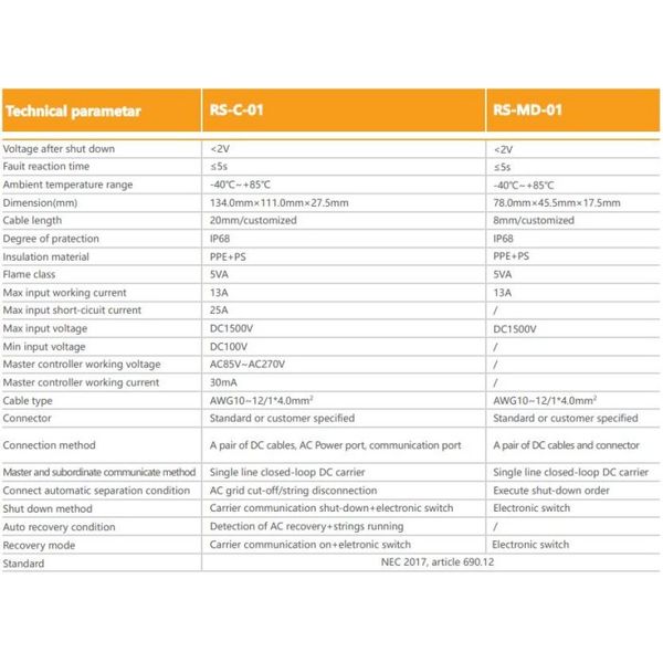 Designed to automatically reduce the modules` DC voltage to a touch-safe level within 5 seconds during inverters or other electronic components shut down.