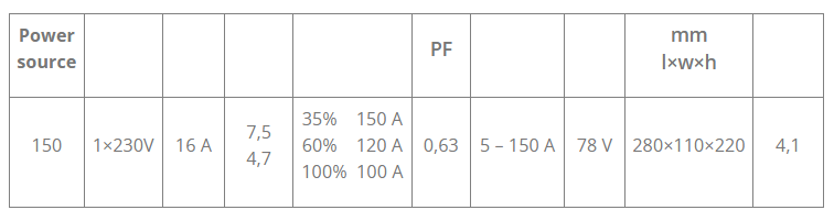 Welding process: MMA (stick), TIG DC Lift and HF start. Materials: Carbon steels, stainless steels, cast irons. Function: Built-in adjustable arc control features (hot start, arc force, antisticking).