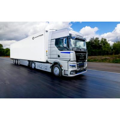 Max. e-axle power cont. / peak: 420 / 550 kW. Range simulated: 700 km. Fuel cell power: 120 / 240 kW. Battery capacity: 124 kWh. H2-capacity: 54 kg. Filling time: <20 min. Tank pressure: 700 bar. Min. wheelbase: 3900 mm. Base truck: MAN TGX and TGS. Availability: available to order now.