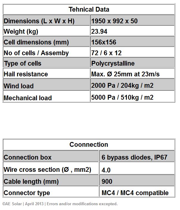 12 year product warranty.12 years guarantee at 90% rated performance.30 years guarantee at 80% rated performance.Certified from: TUV, IEC 61215, IEC 61730, CE, ISO.50 mm aluminum frame .Up to + 3% positive power tolerance.Cell efficiency up to 17.64 %