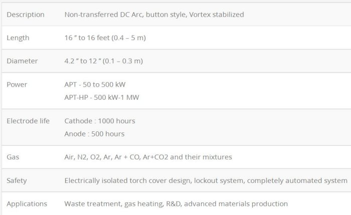 Our APT torch is at the heart of our proprietary plasma waste processing and waste-to-energy technologies and have been deployed by the US Department of Defense. Developed by our team initially as a game-changing solution for waste destruction and subsequent energy recovery, the plume from an APT can reach more than 5000oC, an excellent tool for the transforming of materials to value-added products. This torch can be modified for uses with different gases and reach power levels ranging from 50 kW to 500 kW. Available in a light weight (magnet-free), compact configuration, the APT offers an electrode service life which can exceed 1000 hours of continuous operation in a multitude of other applications in the metallurgical, advanced materials, nanomaterial and oil & gas sectors.