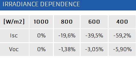 Maximum power [Pmax]: 250. Cells: Monokrystaliczne Si. Size: 156 x 156 mm. Nr of cells: 60. Short circuit current [Isc]: 8,8. Open circuit voltage [Voc]: 37,9. Maximum power current [Imax]: 8,28. Maximum power voltage [Vmax]: 30,25. Module efficiency: 15,40 %. Maximum system voltage: 1000 V DC. Tolerance: 0 +4,99. Temperature coefficient current TcI: +0,03 %/°C. Temperature coefficient voltage TcV: -0,32 %/°C. Power temperature coefficient TcP: -0,39%/°C. NOCT(800 W/m2, 20°C, AM 1.5, 1m/s): 45 °C