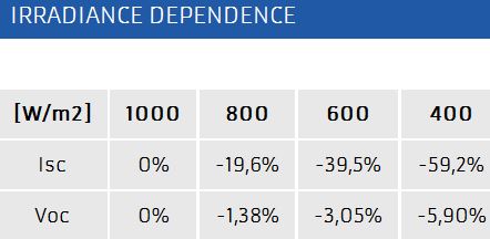 Maximum power [Pmax]: 250. Cells: Monokrystaliczne Si. Size: 156 x 156 mm. Nr of cells: 60. Short circuit current [Isc]: 8,8. Open circuit voltage [Voc]: 37,9. Maximum power current [Imax]: 8,28. Maximum power voltage [Vmax]: 30,25. Module efficiency: 15,40 %. Maximum system voltage: 1000 V DC. Tolerance: 0 +4,99. Temperature coefficient current TcI: +0,03 %/°C. Temperature coefficient voltage TcV: -0,32 %/°C. Power temperature coefficient TcP: -0,39%/°C. NOCT(800 W/m2, 20°C, AM 1.5, 1m/s): 45 °C