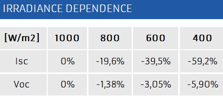 Maximum power [Pmax]:240. Cells:Polycrystalline Si. Size: 156 x 156 mm. Nr of cells:60. Short circuit current [Isc]:8,55. Open circuit voltage [Voc]:37,65. Maximum power current [Imax]:8,03. Maximum power voltage [Vmax]:29,9. Module efficiency:14,70 %. Maximum system voltage: 1000 V DC. Tolerance:0 +4,99. Temperature coefficient current TcI:+0,05 %/°C. Temperature coefficient voltage TcV:-0,34 %/°C. Power temperature coefficient TcP:-0,41%/°C. NOCT(800 W/m2, 20°C, AM 1.5, 1m/s): 42 °C