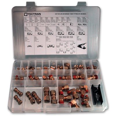 Over 70 of the most popular compression-style DOT-rated airbrake fittings and spare parts. Along with a handy tube cutter are contained for 1/4”, 3/8” OD nylon tubing sizes.