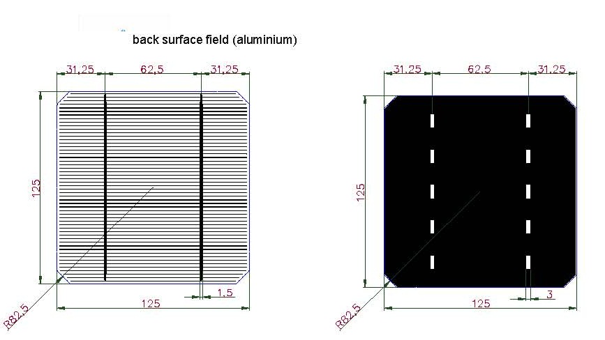 - Back (+): 3.0 mm wide soldering pads (silver),back surface field (aluminium)