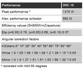 The single family house specialist for high energy yield throughout the whole year. During winter an in periods with lower solar irradiations often only 400W/m2 are available. The temperature differences between collector and outside are very high. In the chart below you will find out how the energy performance of the collector changes according to the solar irradiation and temperature differences. The values are considered under direct irradiation.