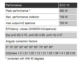 Good performance – even better pricing. The collector for when it matters. During winter an in periods with lower solar irradiations often only 400W/m2 are available. The temperature differences between collector and outside are very high. In the chart below you will find out how the energy performance of the collector changes according to the solar irradiation and temperature differences. The values are considered under direct irradiation.