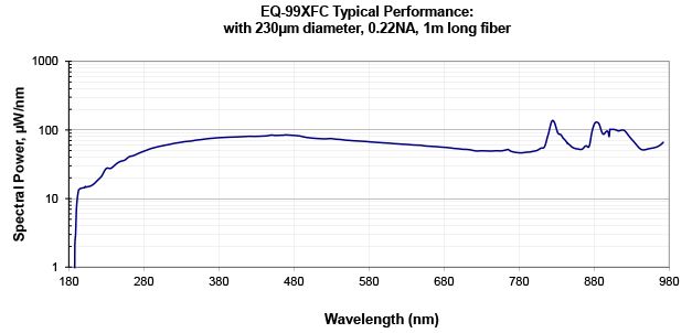 The LDLS EQ-99XFC has integrated collection optics that allow greater ease of use for those needing a fiber connection. The high performance ellipsoidal collector ensures that the ultra-high brightness light and power stability are maintained across the broad spectrum, from 190nm to 2100nm, and efficiently coupled into small diameter optical fibers. Proprietary Fiber-Protection Technology™ enhances DUV performance and significantly extends fiber life by reducing the effects of solarization. Utilizing a patented laser-driven bulb technology* and ultra-clean construction, the EQ-99XFC is ideal for applications requiring ultra-long lamp life combined with high broadband brightness.