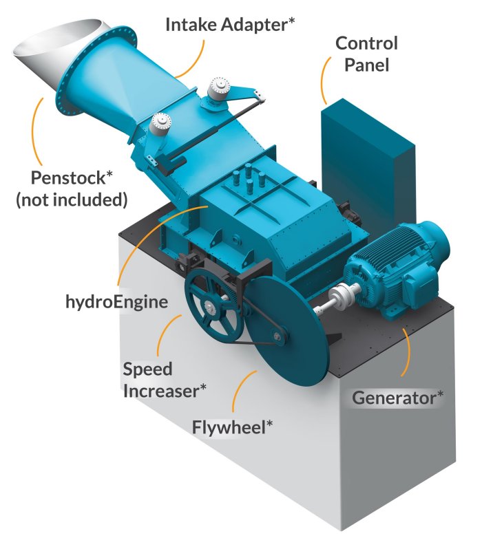 The Free Jet hydroEngine model is rated up to rated 50-1400 kW and does not need a draft tube.