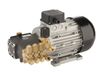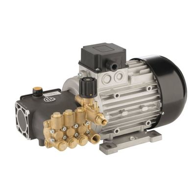 Electric motor pump. Pistons in ceramic-coated stainless steel . Pump head in forged brass with integrated pressure regulating valve and detergent injector. Induction motor.