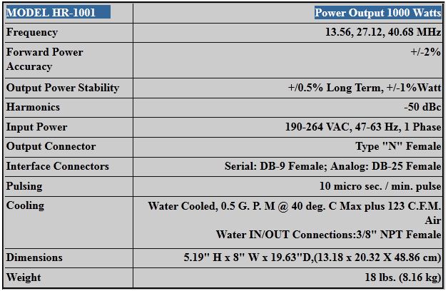 The Seren HR-1001 is a third-generation, 1000 Watt RF Generator. It may be purchased at any fixed frequency between 13.56 - 40.68 MHz. This lightweight, water-cooled ½ rack unit is designed to exceed the most stringent vacuum processing demands. The HR-1001 can be used as the sole source for plasma generation, as a Bias generator,or as one of several generators in a multiple generator configuration. Front panel indicators include AC ON, RF On, Alarm and Interlock. An optional Remote controller (front panel controls and indicators) may be purchased.Seren “HR Series” products utilize Field-Effect Transistors in the exciter and power amplifier stages. The unit operates in a class AB mode providing power accuracy and stability across the entire power range.