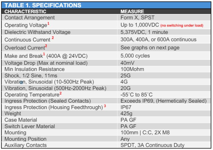 1000V. 300A, 400A and 600A continuous duty versions. Hermetically sealed. Gas Filled. Intrinsically safe. Auxiliary contacts (optional). Industry leading dielectric performance