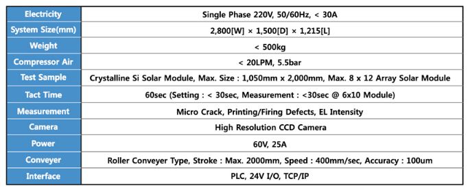 Electroluminescence Measurement for Solar Module .Max. 8x12 Array Mono/Multi Crystalline Silicon Solar Module .Defect Detection Algorithm .Micro Crack, Printing / Firing Defects, EL Intensity .Automatic Loading / Unloading Assembly .Quality Control for In-Line Process