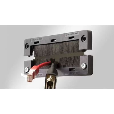 Split brush plates KEL-BES-S for routing cables into server racks, control panels and electrical enclosures. KEL-BES-S is also an ideal solution for entry and exit of cables that are routed inside raised floors, e.g. in computer centres. The brush plates can either be mounted via screws or via expanding rivets. Due to the split frame the KEL-BES-S can also be subsequently installed around the routed cables. The KEL-BES-S frames match exactly the cut-out dimensions for 10-, 16- and 24-pin standard industrial connectors.