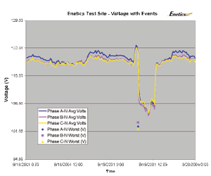 The LM-5400 series calculates rms voltage and current values every cycle and saves time-stamped event data if they are out of user specified limits. One cycle swell/sag data is then available for every event. Min rms, max rms and average rms values are stored for every storage interval. Text data on up to 3000 events can be saved.