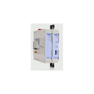 Many users can be integrated by bundling several FO signals on one RS-485 bus. The system consists of an mcPS-1 power supply module and up to ten mcFO fibre optic modules with two fibre optic ports each. The mcPS-1 power supply module has an integrated RS-485 connection for coupling the transmission protocol and supplies the connected fibre optic modules via bus connectors. It is possible to physically couple up to 30 further star coupler groups at the RS-485 interface.