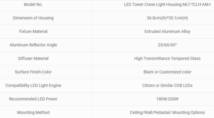 This LED tower crane light housing MLT-TCLH-AM-I is the medium size of round COB LED tower crane lighting fixture from Moonlight LED tower crane light A series. An adjustable mounting bracket allows you to direct illumination where it`s needed. Modern design, high efficacy heat pipe as the core of the heatsink and superior corrosion resistant coating finish housing, high reflectance aluminum reflector with different angles, make this housing can be used for variety of commercial and institutional LED lighting applications.