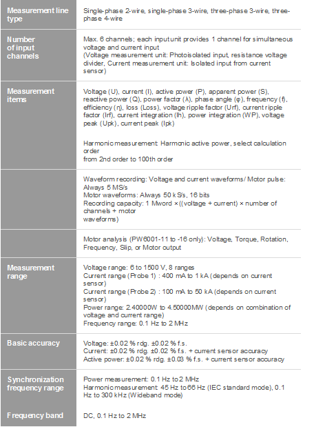 - Basic accuracy of ±0.02%*1 for power measurement *1 PW6001 accuracy only. Instrument delivers accuracy of ±0.07% even after the current sensor accuracy has been added.