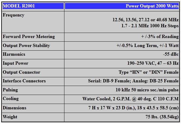 The Seren R2001 is a second-generation, 2000 Watt RF generator. It may be purchased as a fixed frequency of 12.56, 13.56, 27.12 and 40.68 MHz versions or as a variable frequency 1.7 – 2.1 MHz generator. This lightweight, water cooled unit is designed to exceed the most stringent vacuum processing demands. The R2001 can be used as the sole source for plasma generation, as a Bias generator, or as one of several generators in a multiple generator configuration. The front panel controls and indicators are logically grouped, with operational status shown on the front panel four line fluorescent display.