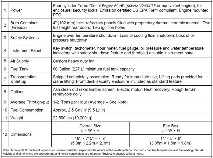 Shipped from the factory completely assembled ready for immediate use and does not require disassembly for relocation. The firebox is also used for disaster recovery and Homeland Security contingencies and for certain MSW disposal applications. Electrically powered version available for permanent (stationary) installations.