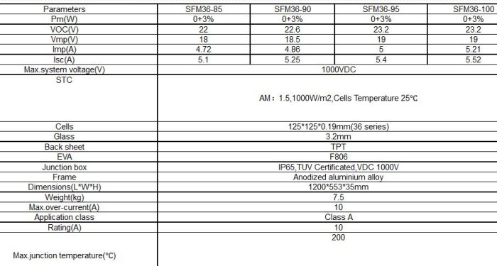 Rated Battery Working Temperature: 45±2 (NOCT°c) Maximum System Voltage: 1000 (VDC) Operating Temperature Range: -40-+85 (°c)., Maximum Pressure: 2400 (Pa) , Hail Loading: 23, 7.53 (m/s,g).Typical Characterisrics at STC.AM=1.5,1000W/m2,Cells Temperature 25°c
