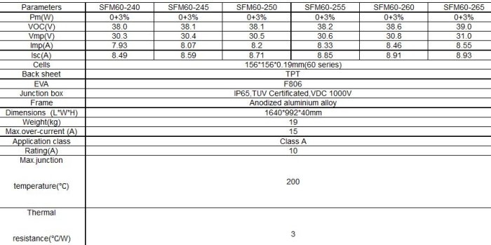 Rated Battery Working Temperature: 45±2 (NOCT°c).Maximum System Voltage: 1000 (VDC).Operating Temperature Range: -40^+85 (°c).Maximum Pressure: 2400 (Pa).Hail Loading: 23, 7.53 (m/s,g).Typical Characterisrics at STC.AM=1.5,1000W/m2,Cells Temperature 25°c