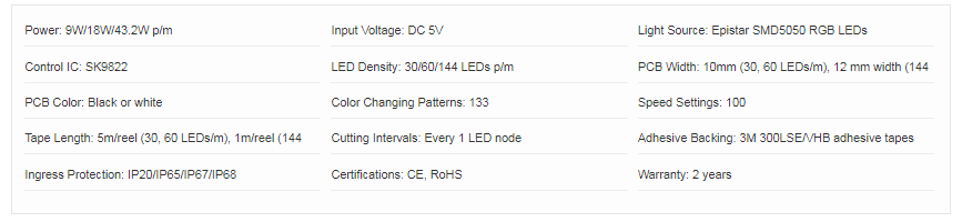 Light Source:SMD 5050 RGB LEDs,LED Density:30/60/144 LEDs per meter,Origin:China,Last Updated:2018-04-15 15:44,Views:232.