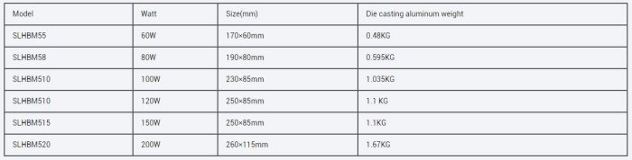 LED Power Consumption: 60W-200W. Operating Voltage: AC85-305V 50/60HZ. LED Chip: San an/Epistar/Bridgelux/ Philips/Osram/Cree. LED Driver: SUNLE PF95% / Meanwell / inventronics/Sosen. Power Factor: >0.90. LED Luminous Efficiency: 80-130LM/W. Lamp Efficiency: >0.8. Material: Die-casting aluminum body. IP Rating: IP44. Warranty: 3-5 years. Finishes: Gray+sliver/Customized.