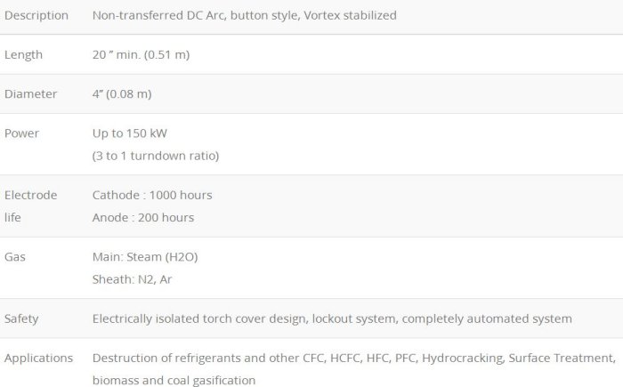 Developed to combat Montreal Protocol-regulated ozone depleting substances such as CFC and HCFC, the SPT plasma torch is an integral part of our developed refrigerant destruction technology, SPARC. Ionizing water into a heightened energy state, the SPT creates highly reactive conditions to completely destroy feedstock chemicals (including HFC and PFC), to clean effluent gas streams, or to control C-H ratios in hydrocracking and biomass gasification applications. Available currently at a power level of 150 kW, the SPT is a novel, innovative tool which can provide your plant engineer or lead scientist with a new level of processing flexibility not previously available in the market place.