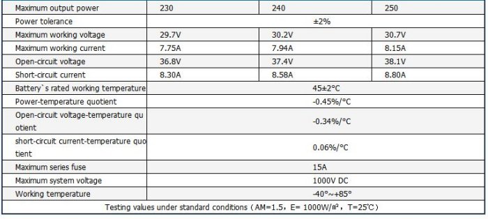 Battery chip mono-crystal 156 x 60 Slice (10x6).Glass 3.2mm High-transmittance glass with low-iron suede.Frame mount Anodized aluminium alloy.Connecting box TUV Certification, MC4 connector* length of cable 900mm.Dimension(A x B X C) 1650 x992 x50mm.Weight 19.5kg.Mechanical load 5400Pa