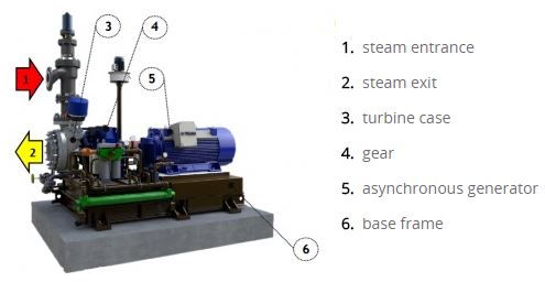 On the steam turbine schema above you can see the easy set up. The priority is with generating heat, in our case steam in the boiler for the current technology. The steam travels to the steam divider and then is reduced to the required pressure at the reduction station. The Micro Steam Turbine is connected in parallel to the steam reduction station in order to increase the efficiency of the whole heating circulation.