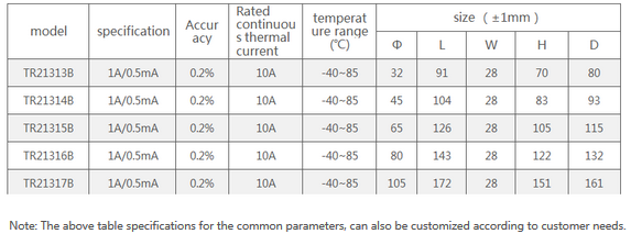 TR21 series of residual (zero sequence) current transformers, designed to collect the remaining (zero sequence) current signal and design. Remaining (zero sequence) current is usually mA level, and must be through the way of the core, the balance of characteristics, interference and linearity higher. This series of products wide measuring range, rated current range: 10mA ~ 5A, rated secondary current range: 0 ~ 5mA, excellent high permeability magnetic core and advanced production process to ensure its accuracy level, reliability, etc. skills requirement.