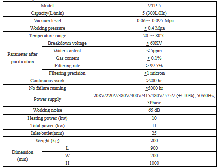 VTP-5(300 liters per hour) Single Stage Vacuum Transformer Oil Purifier is mainly used to separate impurities, dehydration, degasification and improve the quality of used transformer oils. It mainly adopts vacuum purification principle, Italian three-dimensional flash technology, thin film evaporation technology and multi-stage precision filtration, so that the Vacuum Transformer Oil Filtration Machine can remove the water, impurities, gas and other harmful substances from oil and reach new oil standards. This Transformer Oil Filtration Machine also has the functions of oil pumping, oiling, vacuum drying, hot oil circulation filtering etc.